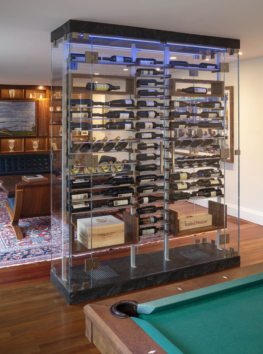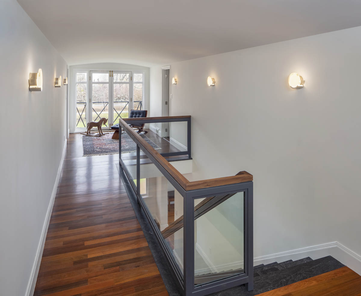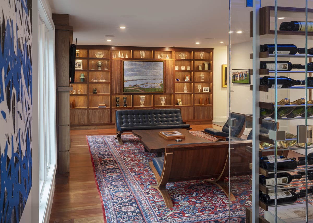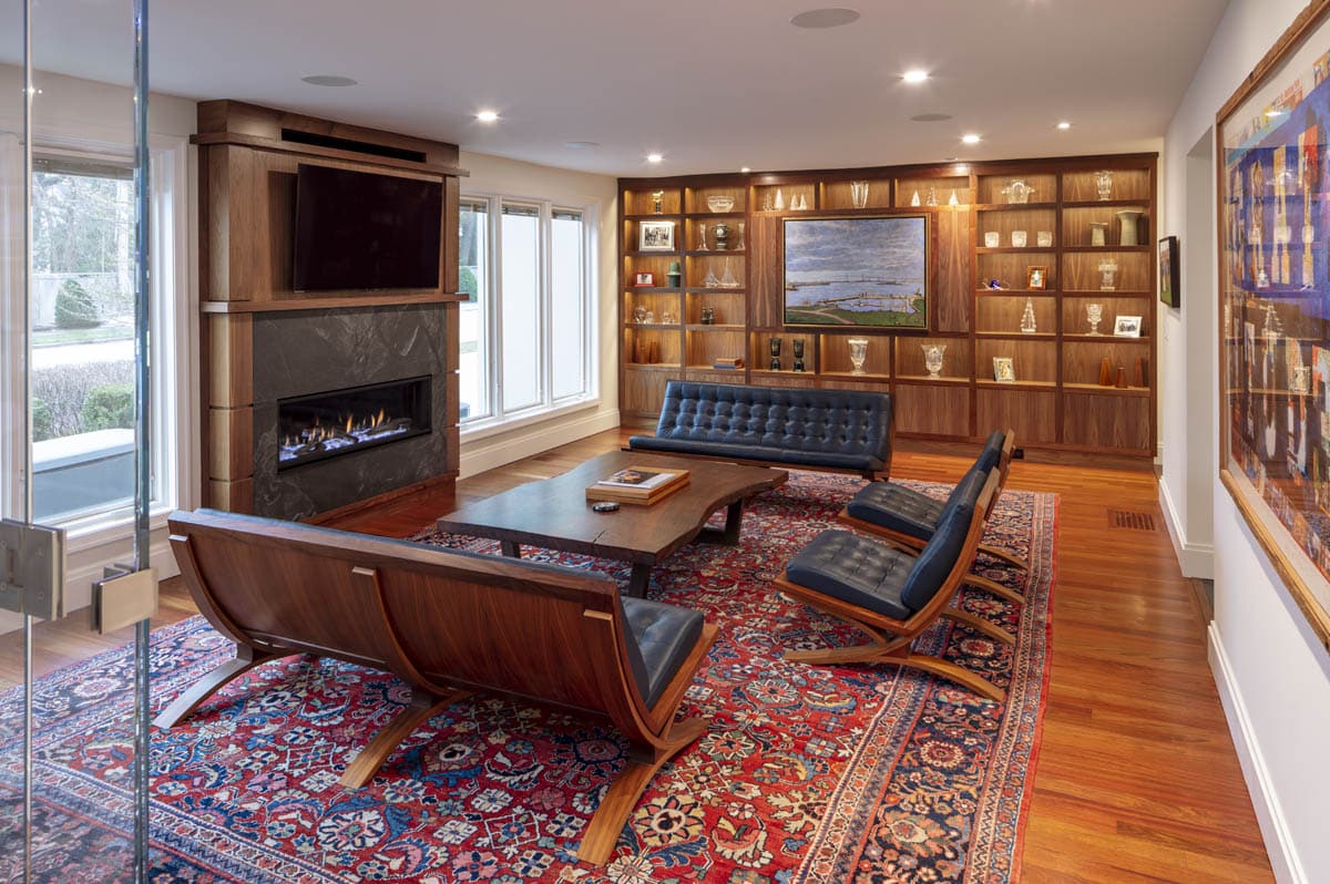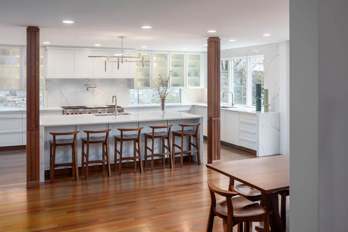 The majority of the original interior of this 1950’s house on the East Side was remodeled during this extensive renovation. The location of the kitchen was relocated to the opposite side of the home creating space for a new entertainment area which includes a custom radius window, gas fireplace and climate controlled glass wine cabinet. The kitchen includes waterfall countertops, three 30” sub-zero refrigerators, and glass windows that extend from countertop height up to the bottom of the upper cabinets. The staircase with granite treads and a glass/metal/walnut railing system was designed to allow for full light and an open feel to the 2nd floor hallway. A multi-head steam shower system with granite slab walls, heated floors, and a granite shower seat complete the master bathroom.
