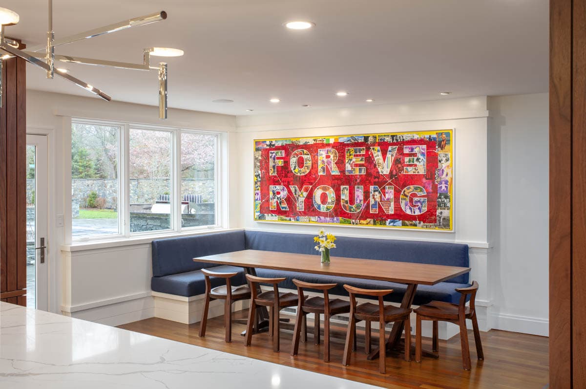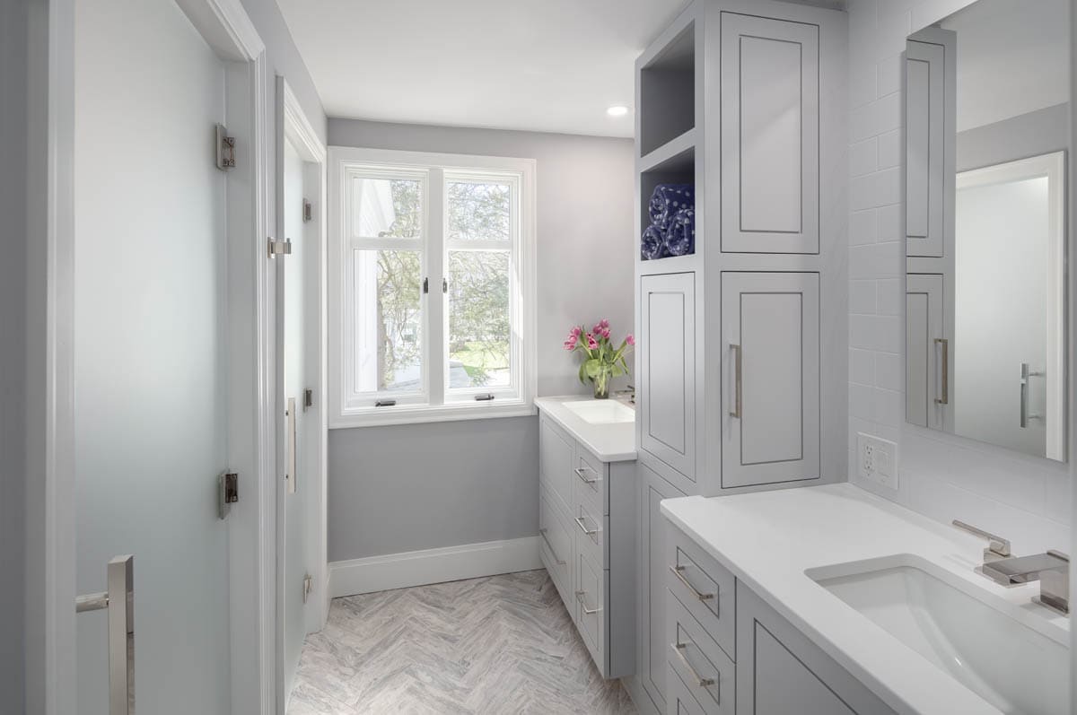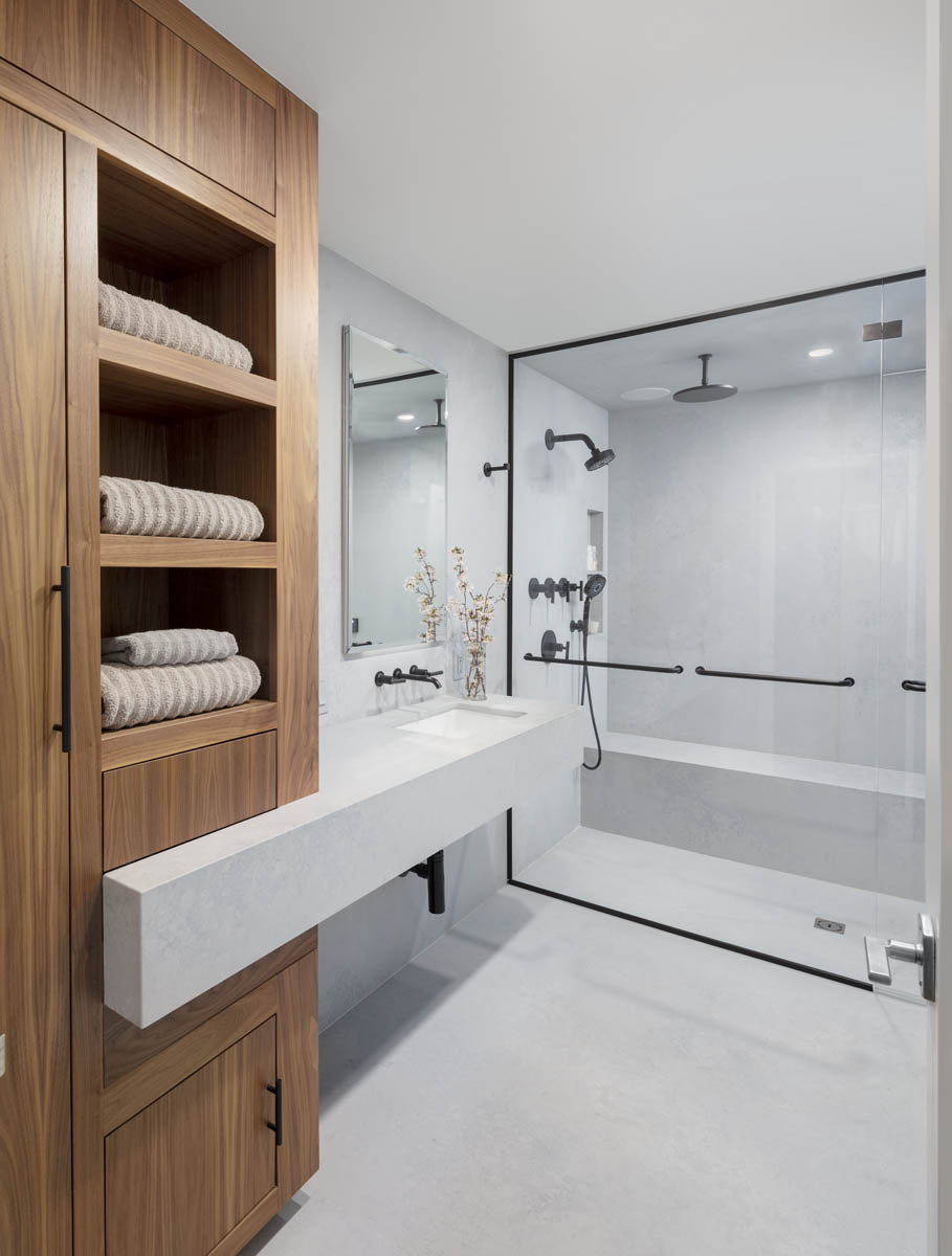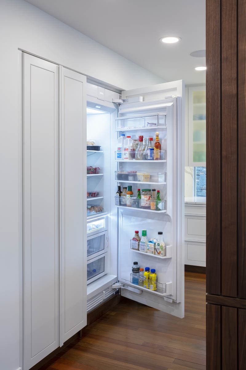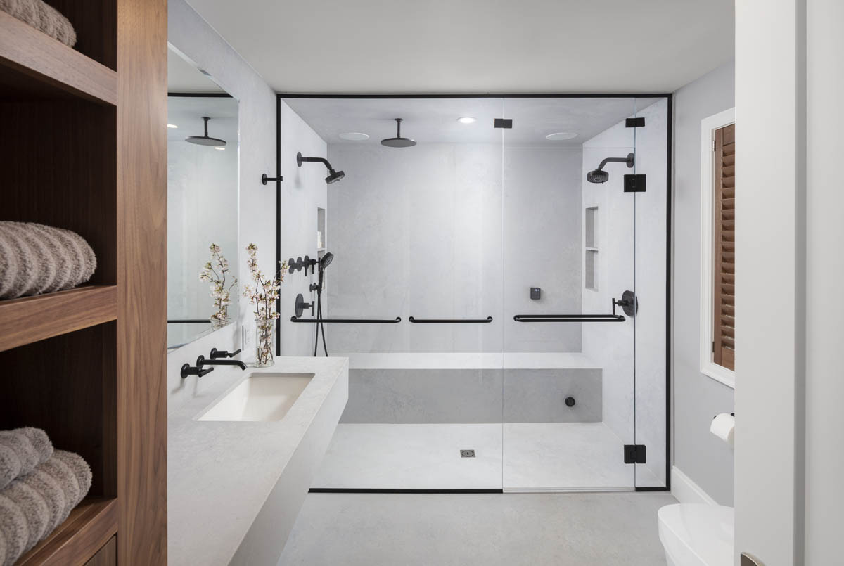 The majority of the original interior of this 1950’s house on the East Side was remodeled during this extensive renovation. The location of the kitchen was relocated to the opposite side of the home creating space for a new entertainment area which includes a custom radius window, gas fireplace and climate controlled glass wine cabinet. The kitchen includes waterfall countertops, three 30” sub-zero refrigerators, and glass windows that extend from countertop height up to the bottom of the upper cabinets. The staircase with granite treads and a glass/metal/walnut railing system was designed to allow for full light and an open feel to the 2nd floor hallway. A multi-head steam shower system with granite slab walls, heated floors, and a granite shower seat complete the master bathroom.