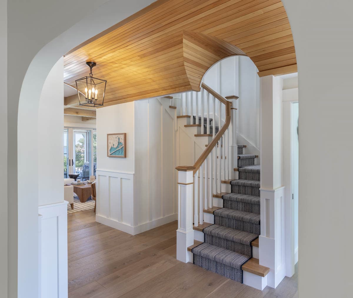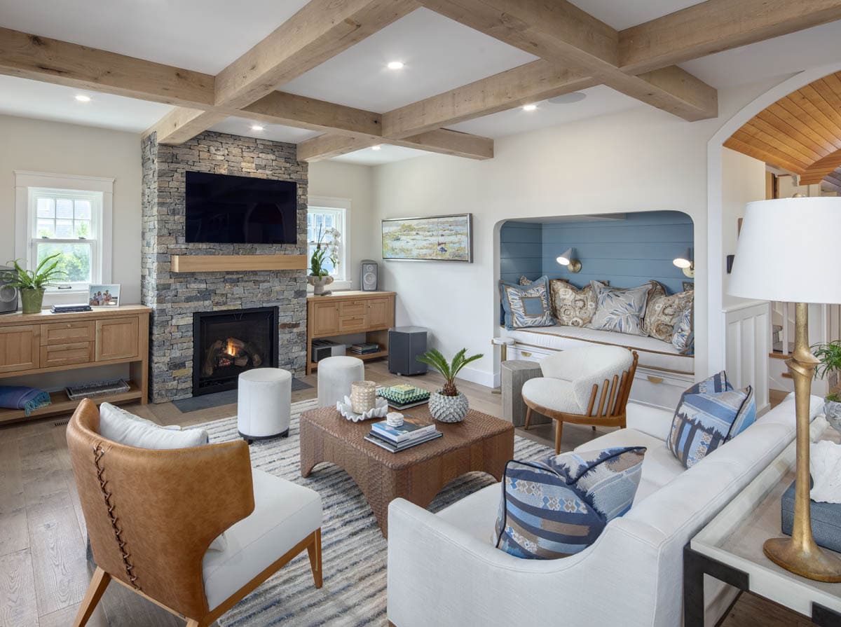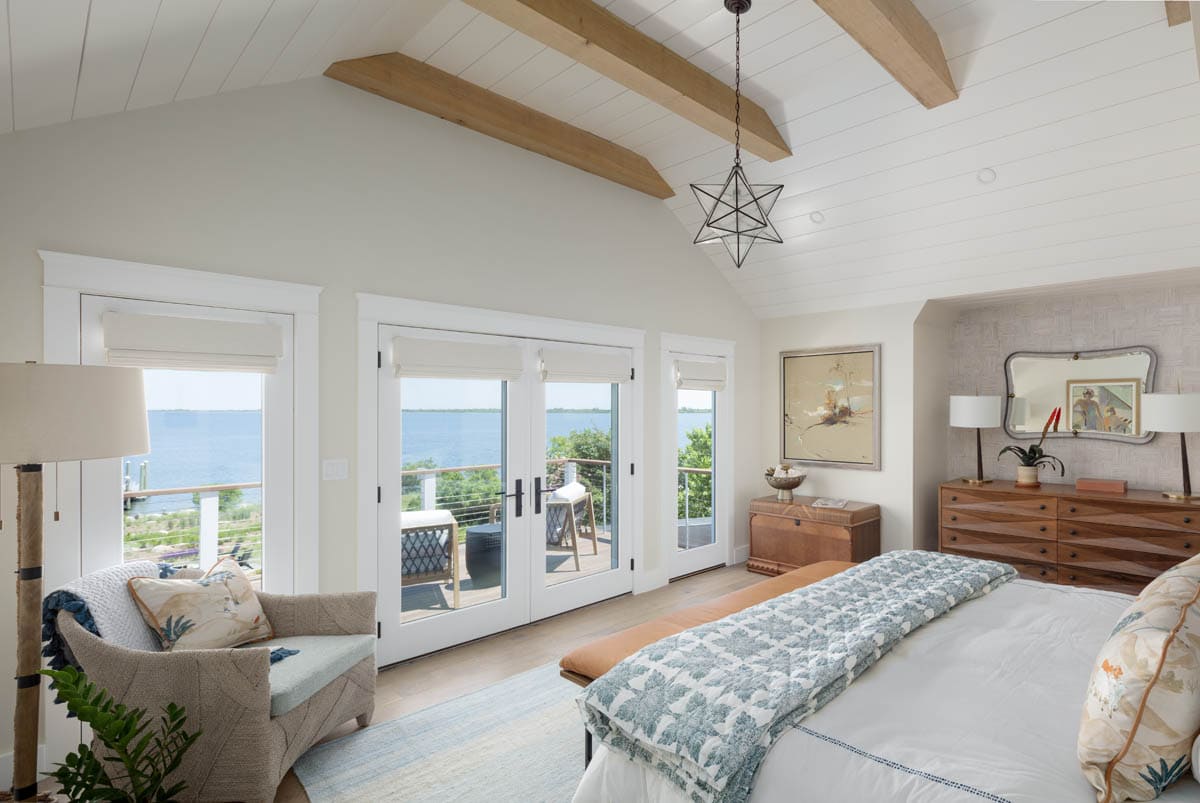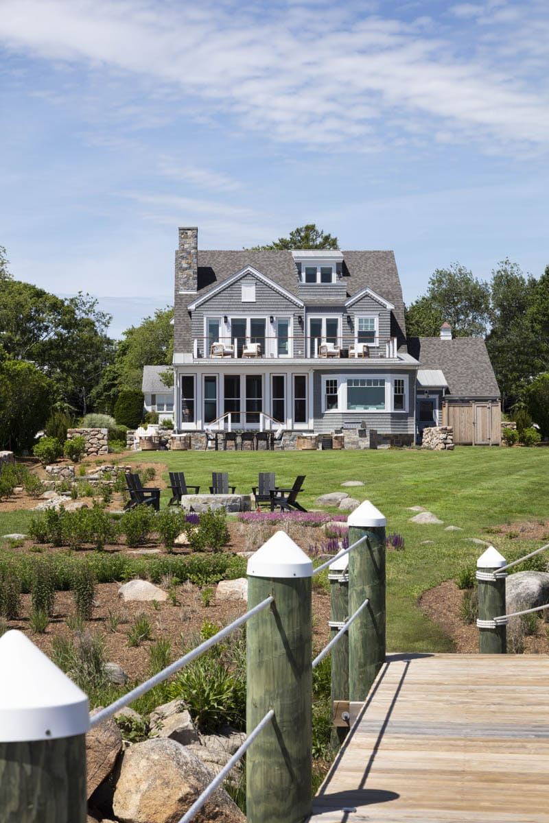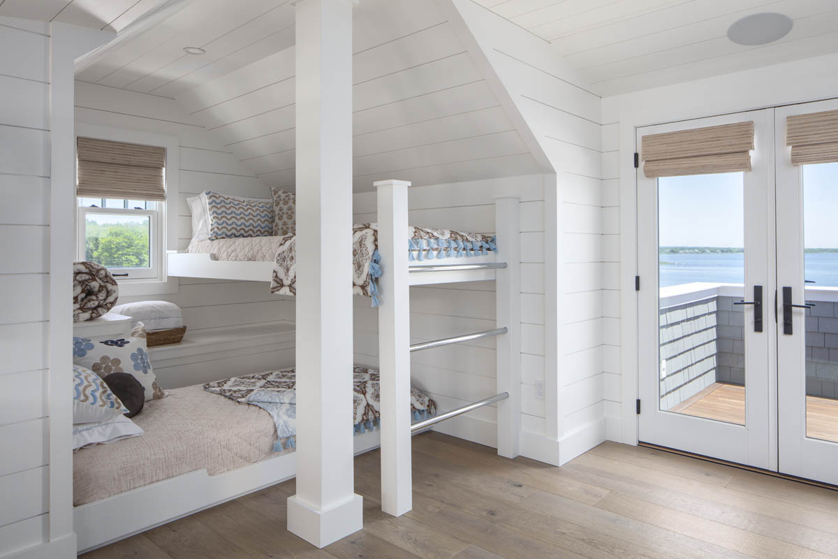 The original house on this lot overlooking Ninigret Pond was demolished and replaced with this stunning custom home. The solid mahogany radius topped front door opens into an entry with a ship-lap barrel ceiling and panelized walls. The main floor offers a built-in window seat in the kitchen and a nickel-gap panelized reading nook in the living room. Rustic white oak beams on the living room ceiling, custom cabinetry in the laundry room and a pantry with wine rack, dishwasher and cubby bench are incorporated into the first floor layout. A water-side porch is enclosed with interchangeable screen and glass panels to create a multi-season room. The 2nd and 3rd floors include a divided light folding glass door in the library, custom made reed paneled cabinetry in the master bathroom, and bunk beds and a solid 4” teak bathroom vanity top built in our custom cabinet shop.