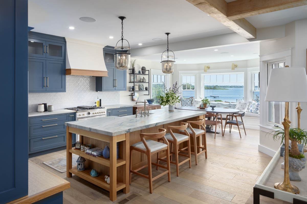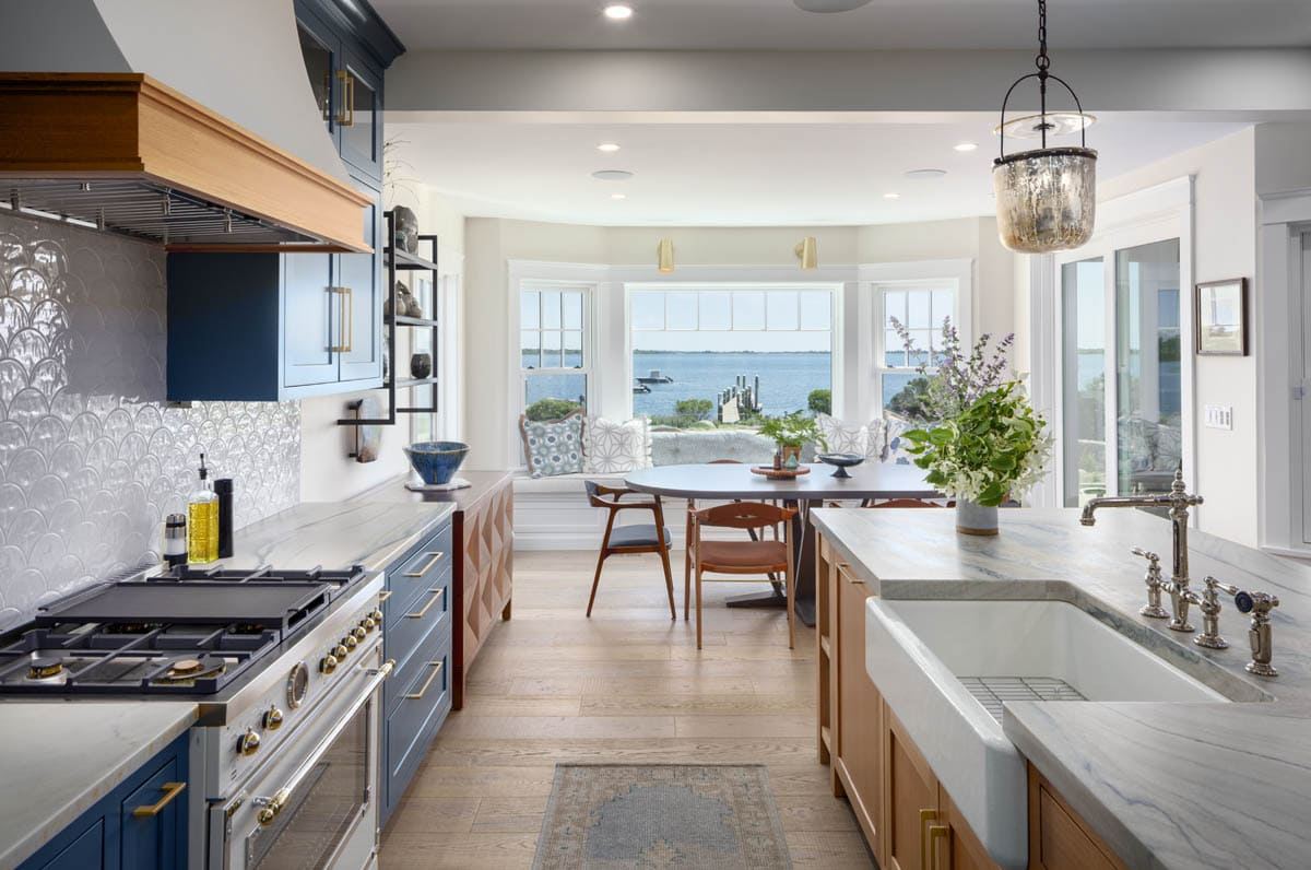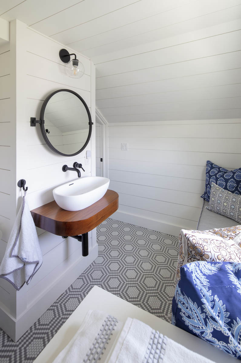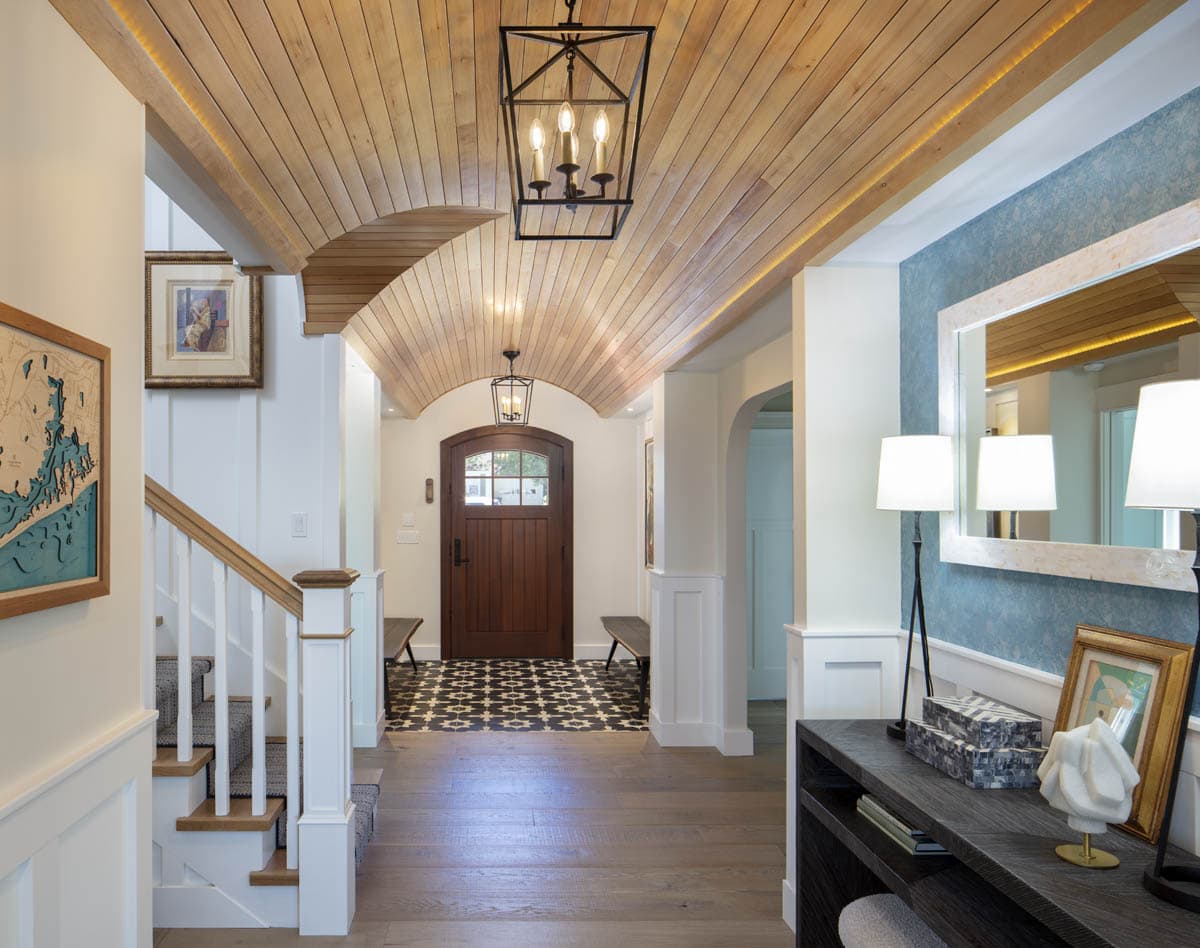 The original house on this lot overlooking Ninigret Pond was demolished and replaced with this stunning custom home. The solid mahogany radius topped front door opens into an entry with a ship-lap barrel ceiling and panelized walls. The main floor offers a built-in window seat in the kitchen and a nickel-gap panelized reading nook in the living room. Rustic white oak beams on the living room ceiling, custom cabinetry in the laundry room and a pantry with wine rack, dishwasher and cubby bench are incorporated into the first floor layout. A water-side porch is enclosed with interchangeable screen and glass panels to create a multi-season room. The 2nd and 3rd floors include a divided light folding glass door in the library, custom made reed paneled cabinetry in the master bathroom, and bunk beds and a solid 4” teak bathroom vanity top built in our custom cabinet shop.