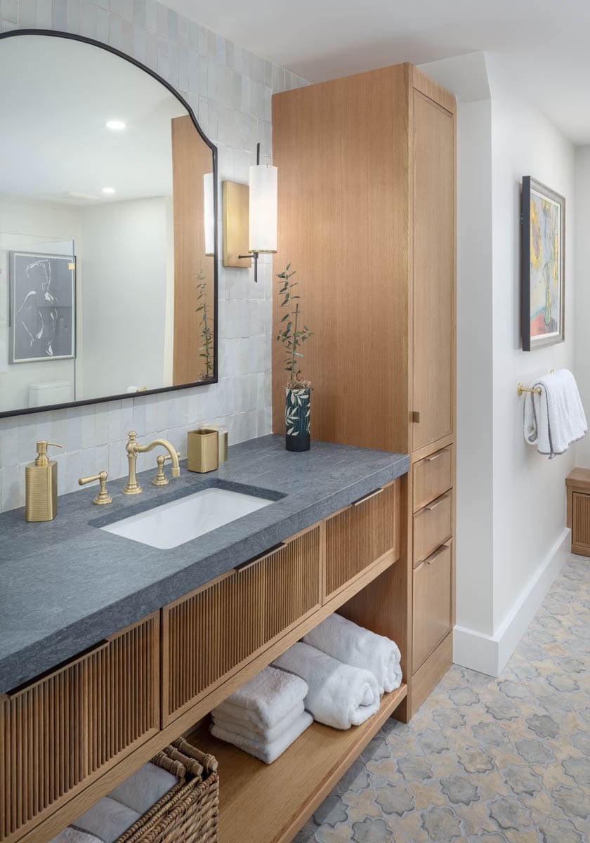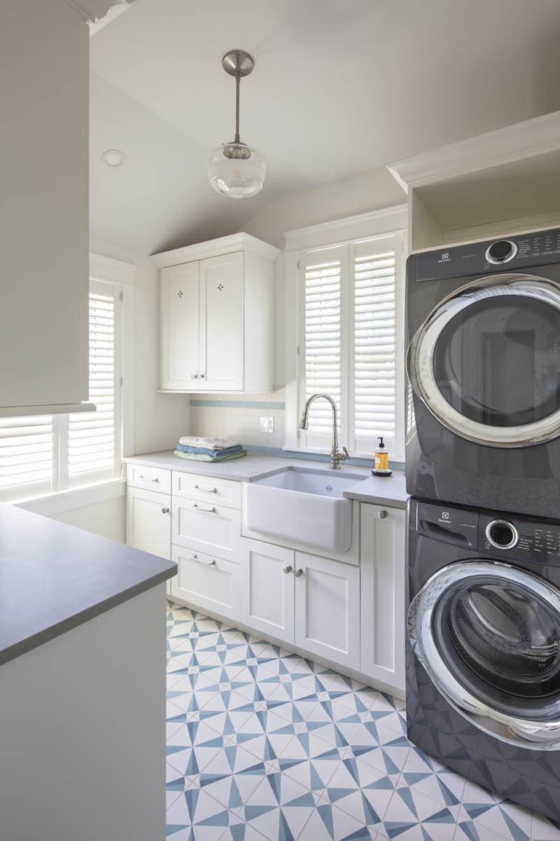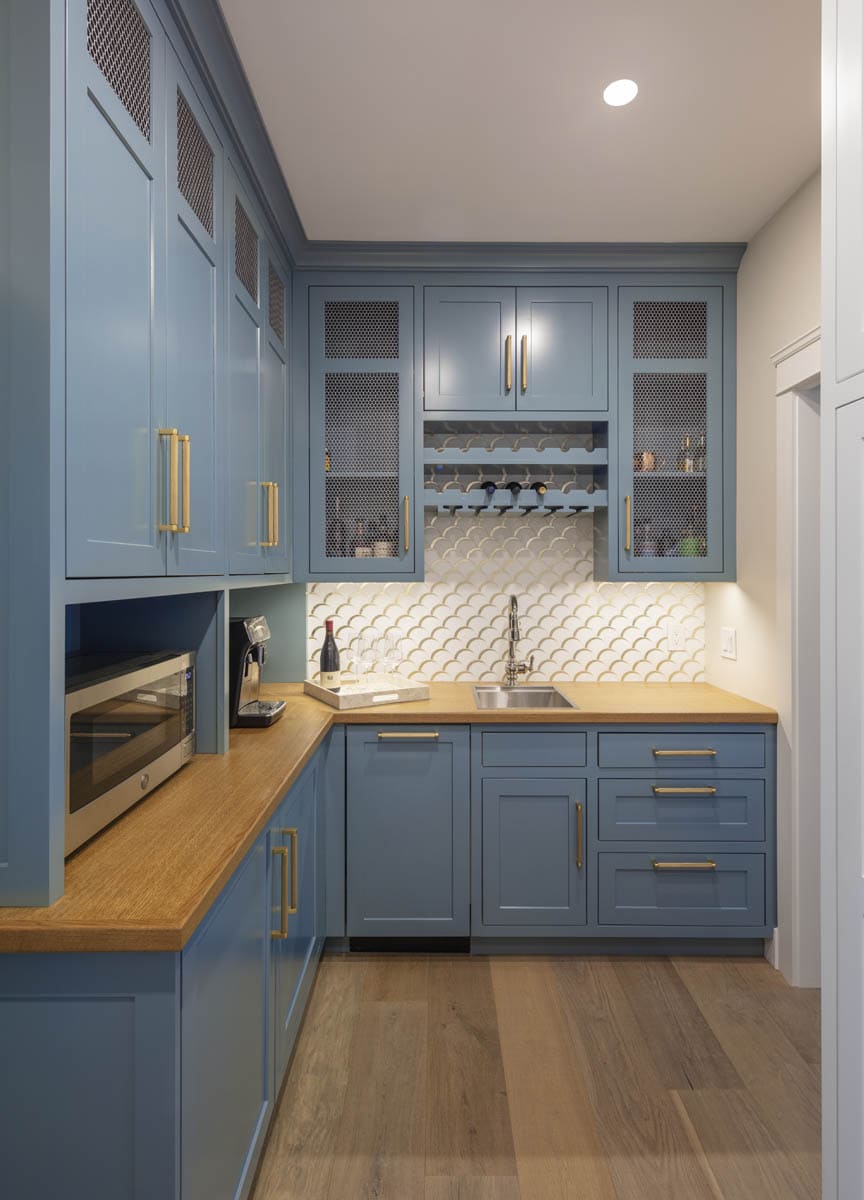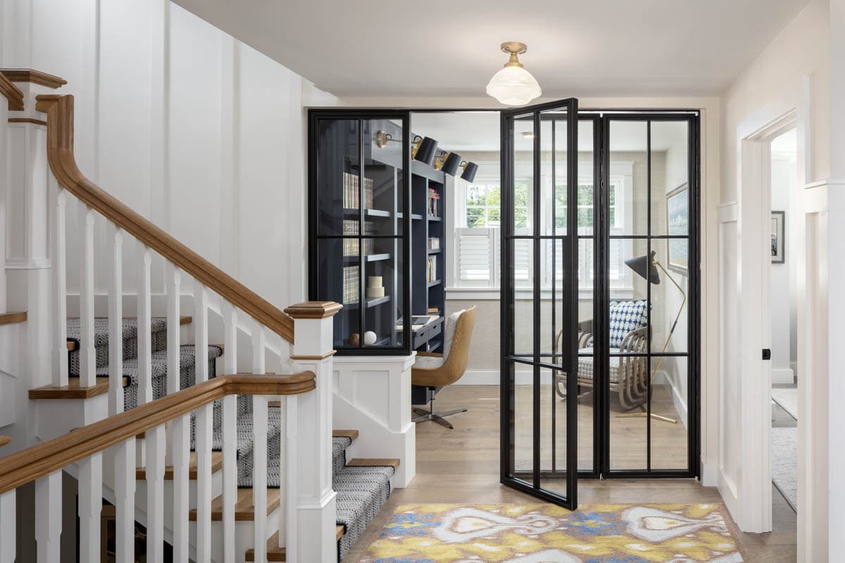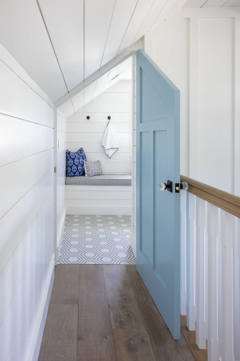 The original house on this lot overlooking Ninigret Pond was demolished and replaced with this stunning custom home. The solid mahogany radius topped front door opens into an entry with a ship-lap barrel ceiling and panelized walls. The main floor offers a built-in window seat in the kitchen and a nickel-gap panelized reading nook in the living room. Rustic white oak beams on the living room ceiling, custom cabinetry in the laundry room and a pantry with wine rack, dishwasher and cubby bench are incorporated into the first floor layout. A water-side porch is enclosed with interchangeable screen and glass panels to create a multi-season room. The 2nd and 3rd floors include a divided light folding glass door in the library, custom made reed paneled cabinetry in the master bathroom, and bunk beds and a solid 4” teak bathroom vanity top built in our custom cabinet shop.
