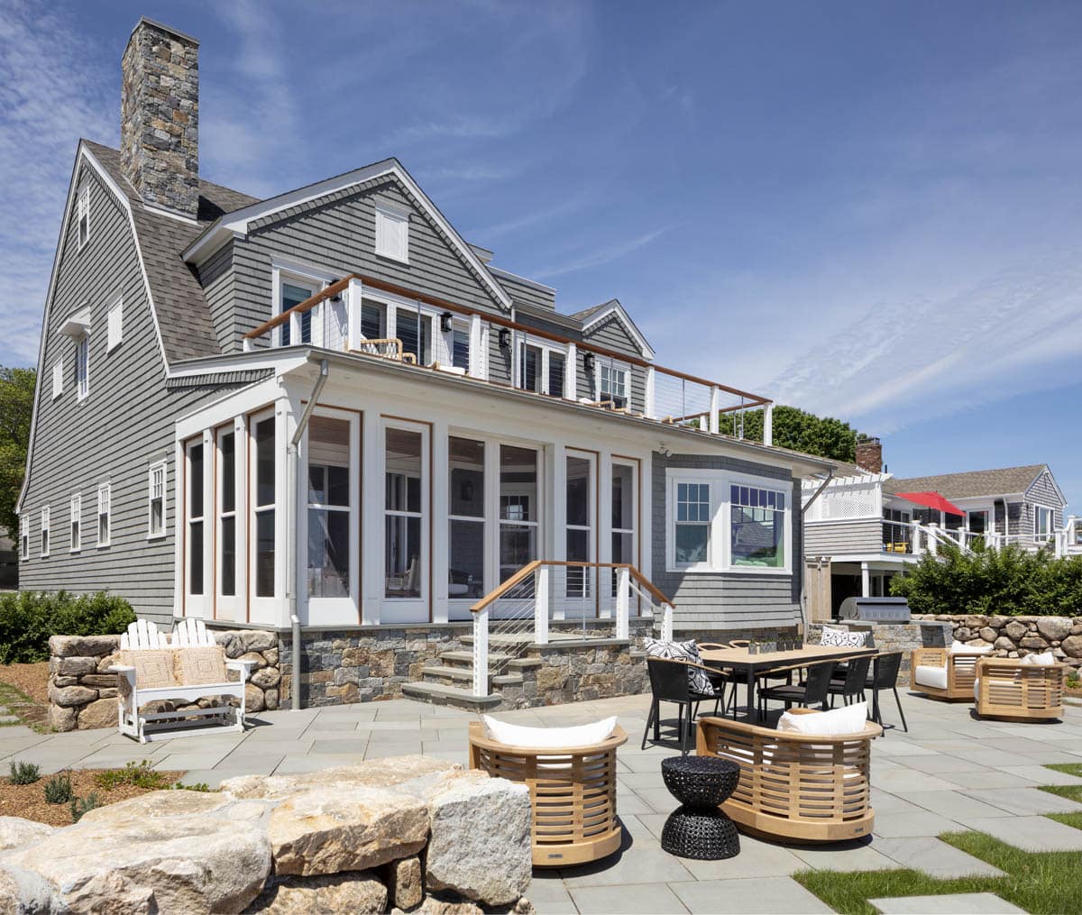 Ninigret Pond Beach Home exterior with gray shingle siding, arched entry porch, and attached garage