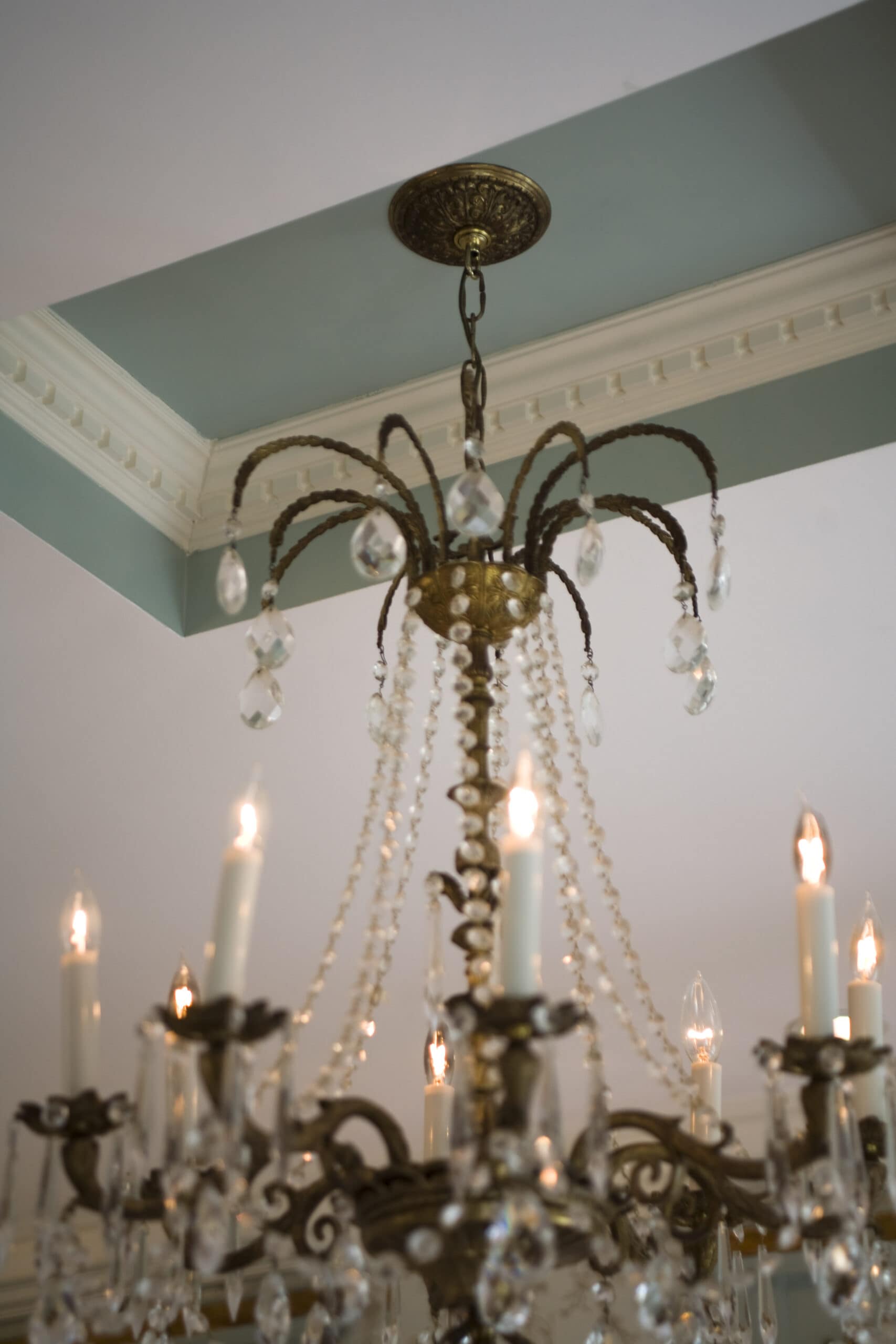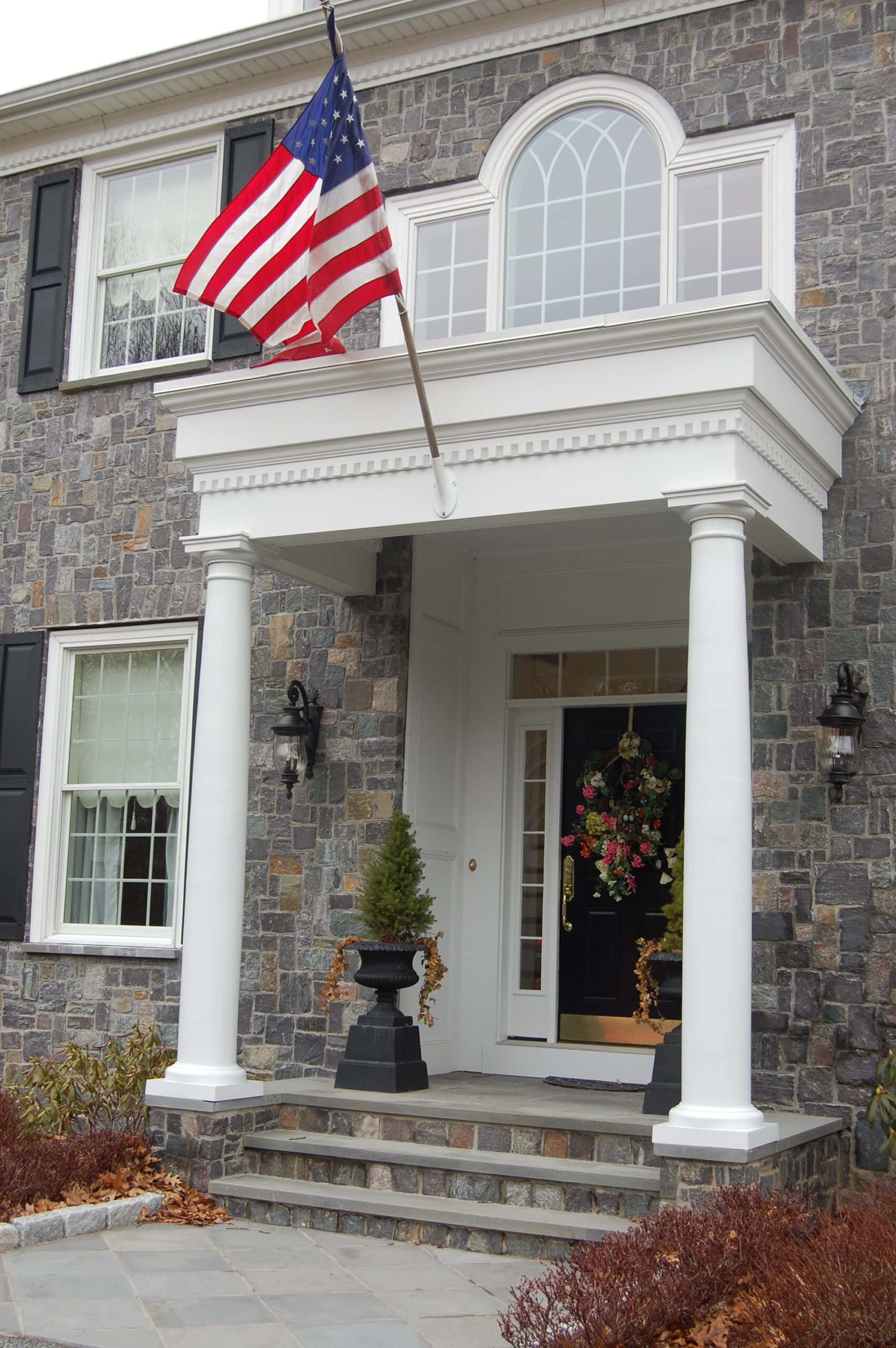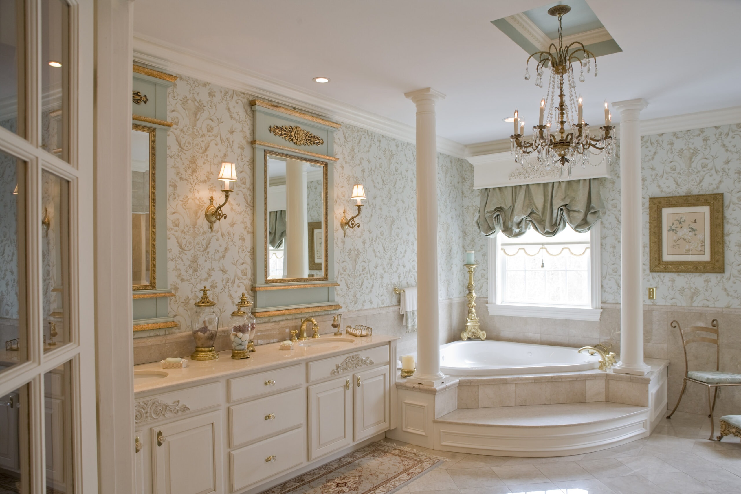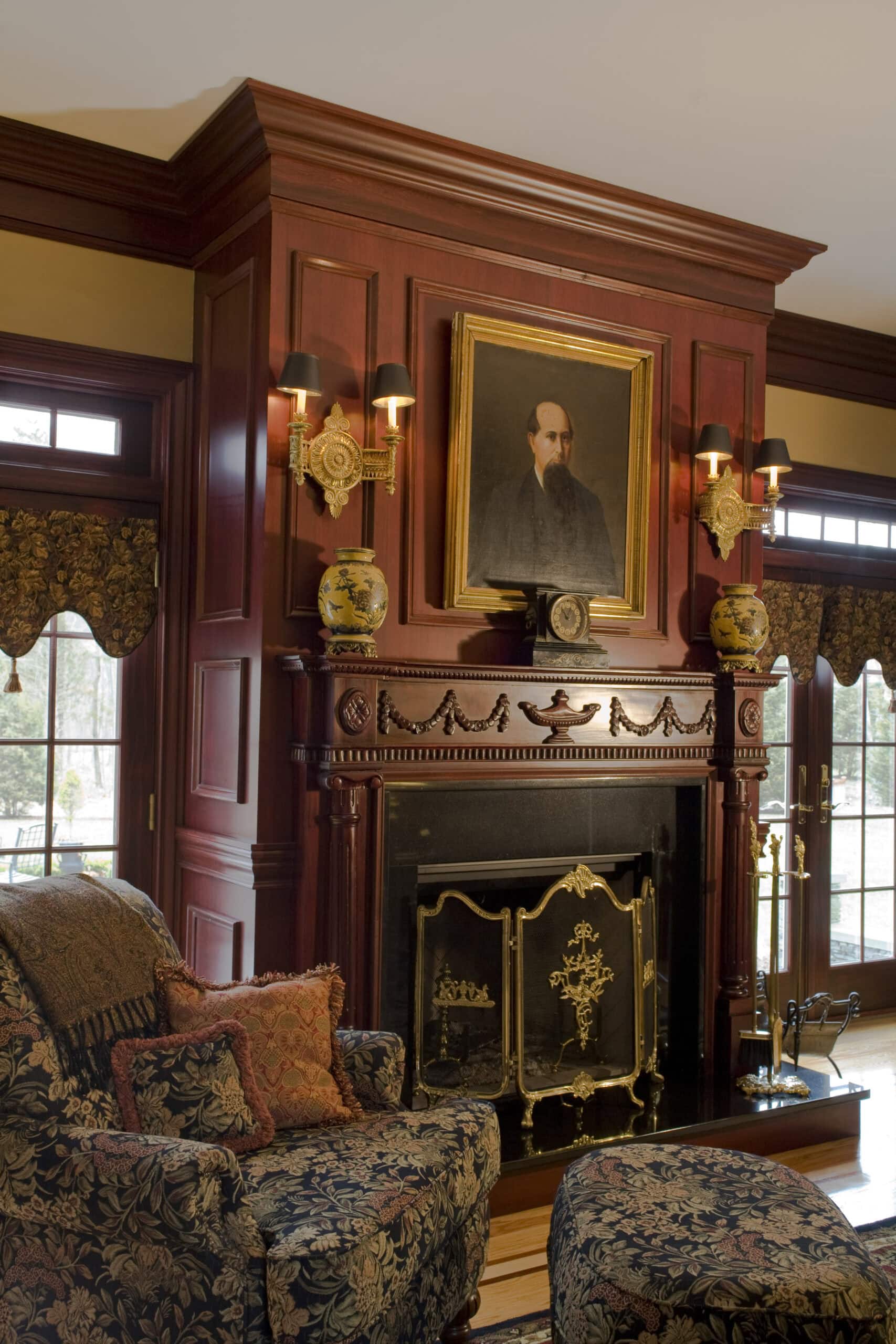 Our client’s dream to replicate historic, Georgian Colonial architecture begins with a stone-faced exterior and an ornate portico detailed with dentil molding at the front entry. The grand foyer and curved staircase lead you directly into the office where Deslandes cabinet makers installed the custom mantel and cherry paneling, built in our shop, around the homeowner’s antique fire surround. The elegance continues even into the bathroom where columns surround the soaking tub and lighting is provided by a chandelier set into a coffered ceiling.
