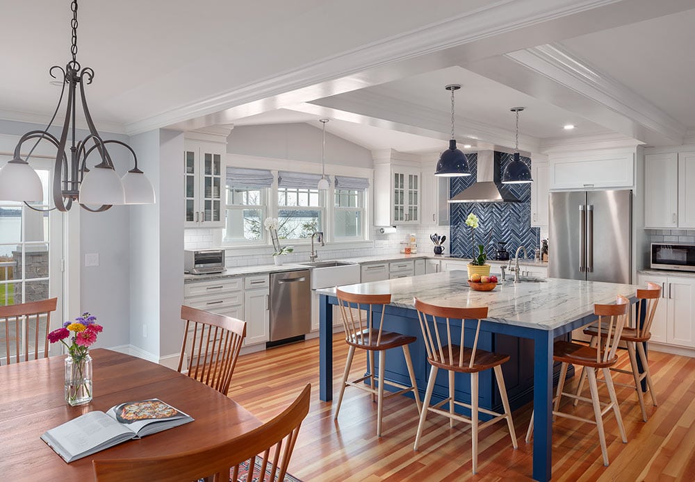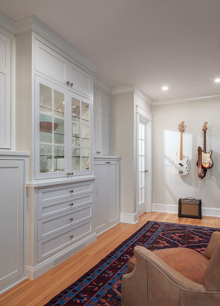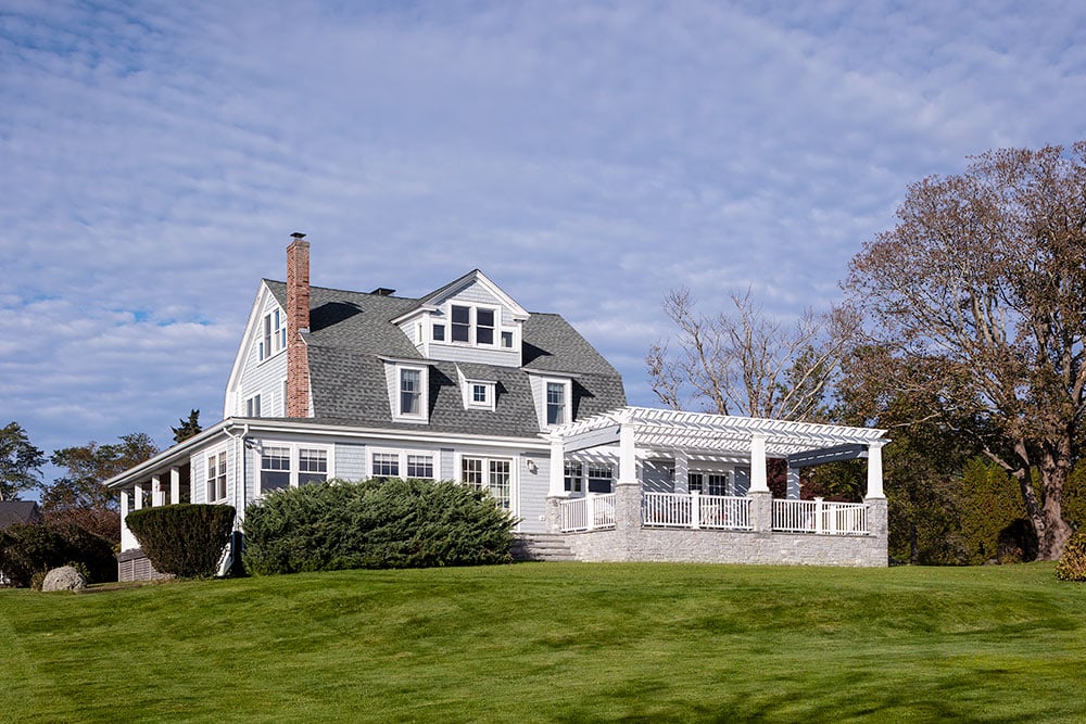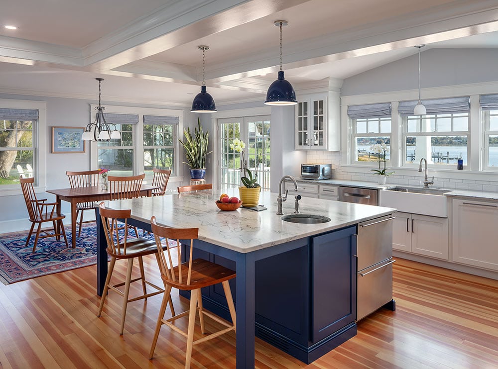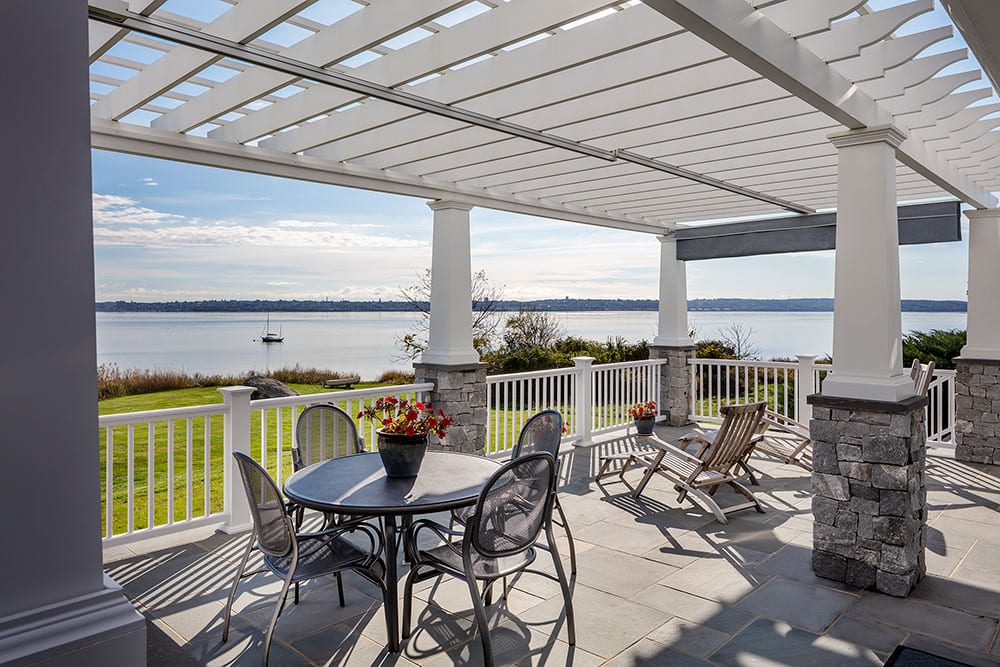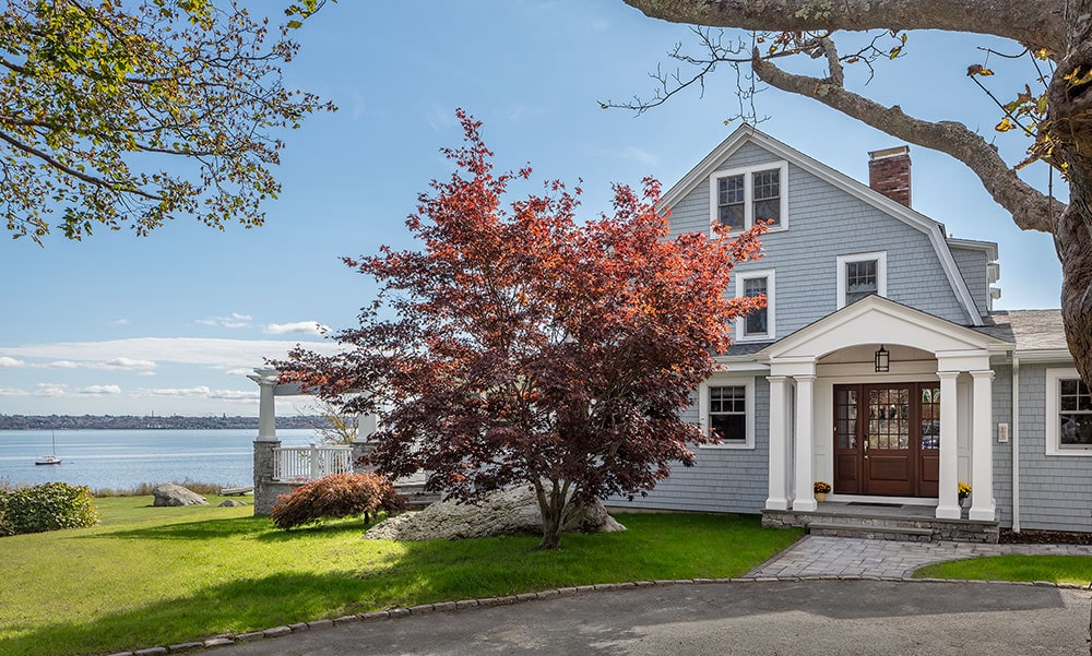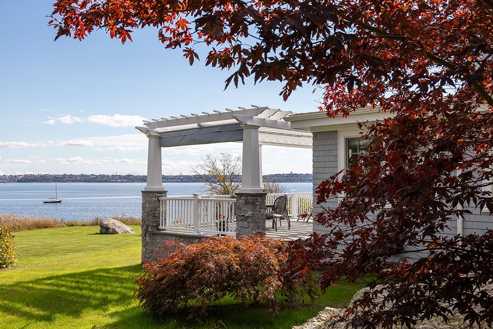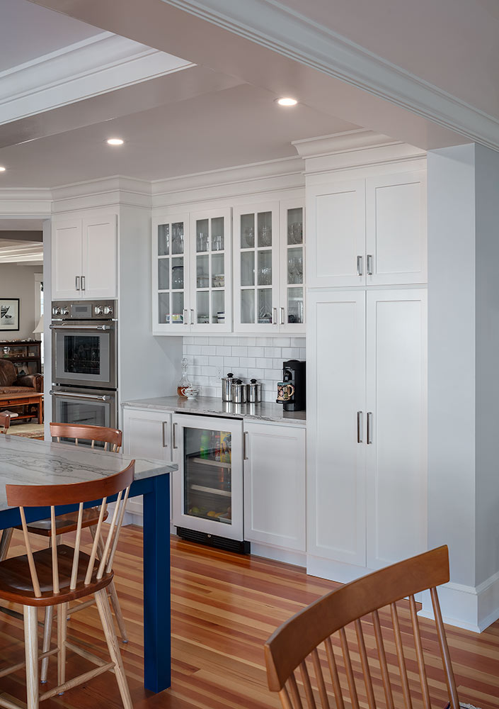 In order to maximize views and provide a comfortable spot for relaxing or hosting, the owners of this Warren home hired Deslandes Construction to build a waterfront addition. The addition houses a custom kitchen, office and music room. A grand mahogany door greets visitors in the relocated entry and a stone patio with portico provides outdoor space. Cabinets built in our custom-cabinet shop provide storage in the music room and a palatial kitchen with large island, coffee station, double ovens and hardwood flooring complete the new space.